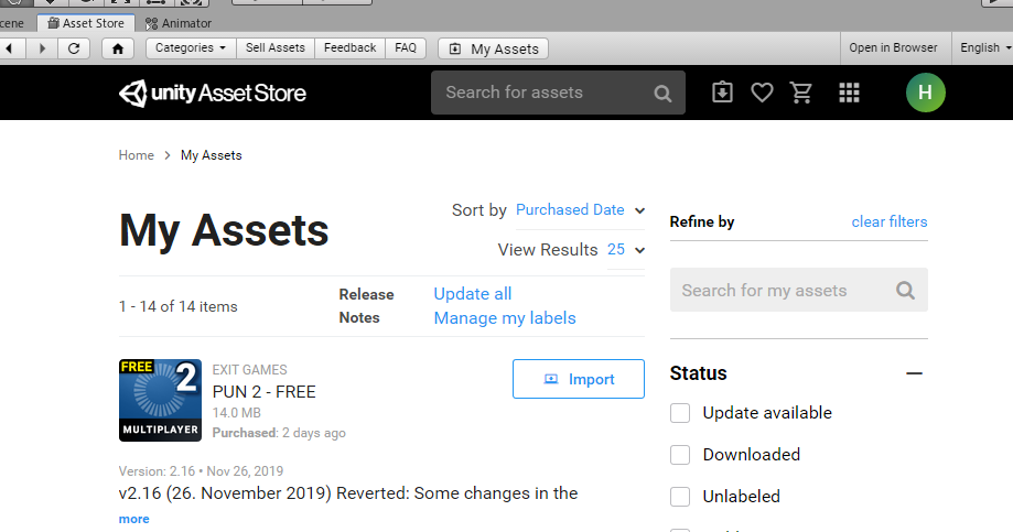 유니티 에셋스토어 -> "PUN 2 - FREE" 설치 후 프로젝트에 Import 합니다.
