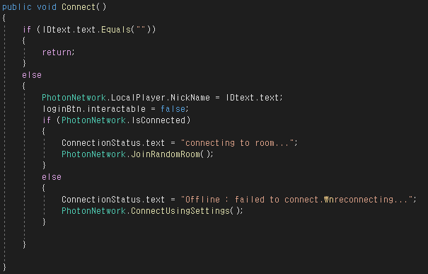 Connect 메소드는 접속 버튼을 누르면 실행할 메소드로, ID를 입력하지 않았다면 아무 반응을 하지 않습니다. ID를 입력해달라는 메세지를 띄우셔도 좋습니다. ID를 입력했다면 PhotonNetwork.LocalPlayer.NickName = IDtext.text; 코드를 통해 해당 로컬플레이어의 닉네임(ID)을 입력한 텍스트로 저장합니다.