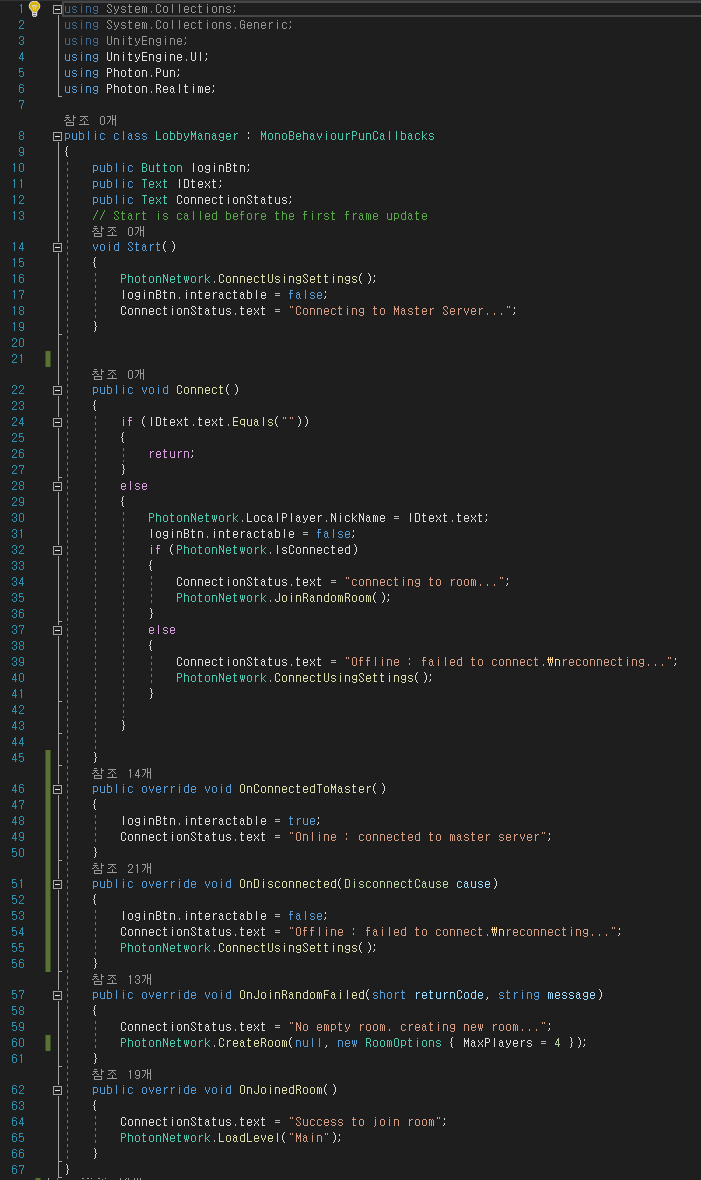 OnConnectedToMaster 메소드는 Photon 서버(Master서버)와 연결되면 실행되는 메소드로, 접속 버튼을 사용 가능케 하며 연결 상태를 온라인으로 바꿉니다.