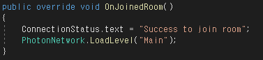 OnJoinedRoom 메소드는 방에 성공적으로 입장했을 경우 실행되는 메소드로, 씬을 Main(채팅을 진행할 씬)으로 옮깁니다. SceneManager.LoadScene()과 달리 PhotonNetwork.LoadLevel() 메소드를 사용한 이유는 네트워크의 정보를 그대로 가져가기 위함입니다.