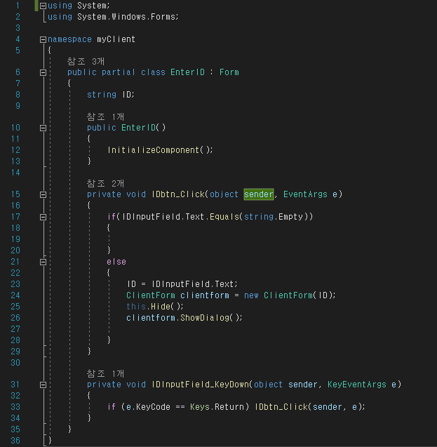 ID 입력 후 버튼 클릭 또는 키보드 엔터키 입력시 현재 창을 숨기고 클라이언트 폼을 띄웁니다.