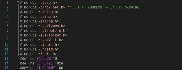 헤더파일 선언 및 listen함수에 들어갈 BACKLOG값, 버퍼사이즈, 파일 이름 크기 정의입니다.