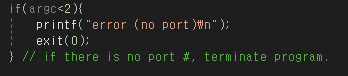 실행파일 이름이 server인 경우 $./server [PORT번호] 로 실행하게 되는데, 포트번호를 입력하지 않은 경우 프로그램을 종료합니다.