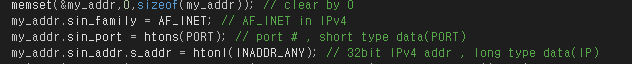 my_addr.sin_addr.s_addr = htonl(INADDR_ANY); // 32bit IPv4 addr , long type data(IP)