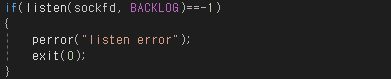 listen함수입니다. BACKLOG값은 대기중인 큐에 넣을 최대 연결 수 라고 하는데 자세한건 더 찾아보시면 좋을것 같네요