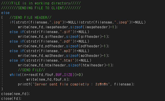 클라이언트가 파일을 요청하면 서버는 파일의 내용을 읽어와 보내주는데, 웹 브라우저가 이를 띄우기 위해선 앞에 html형식의 헤더를 붙여야합니다. 헤더가 없으면 제대로 사진 등을 출력하지 않아요.