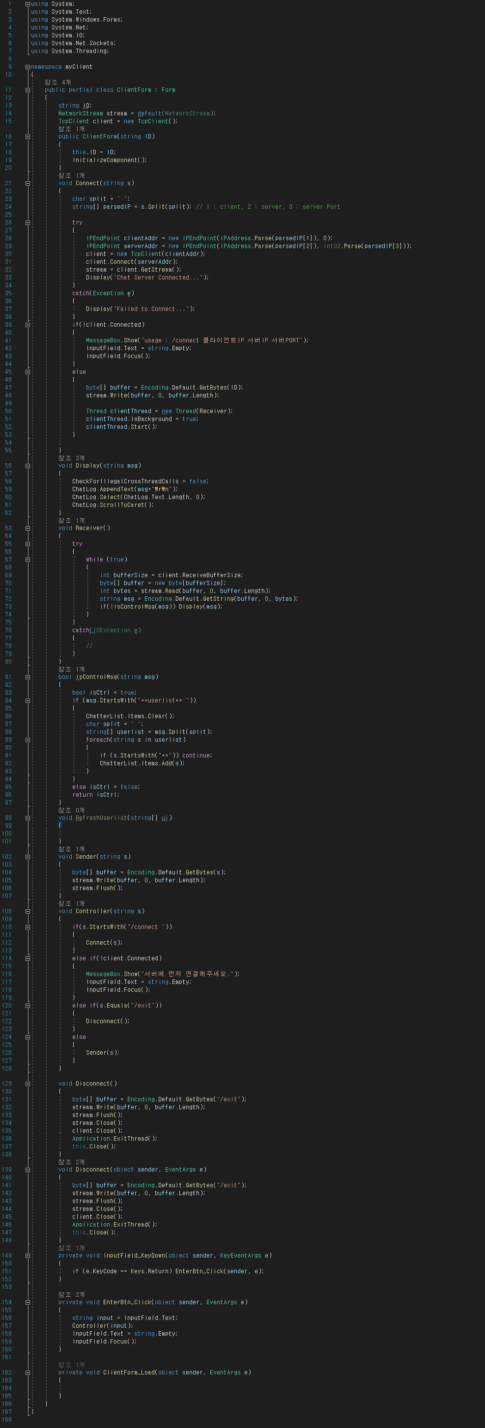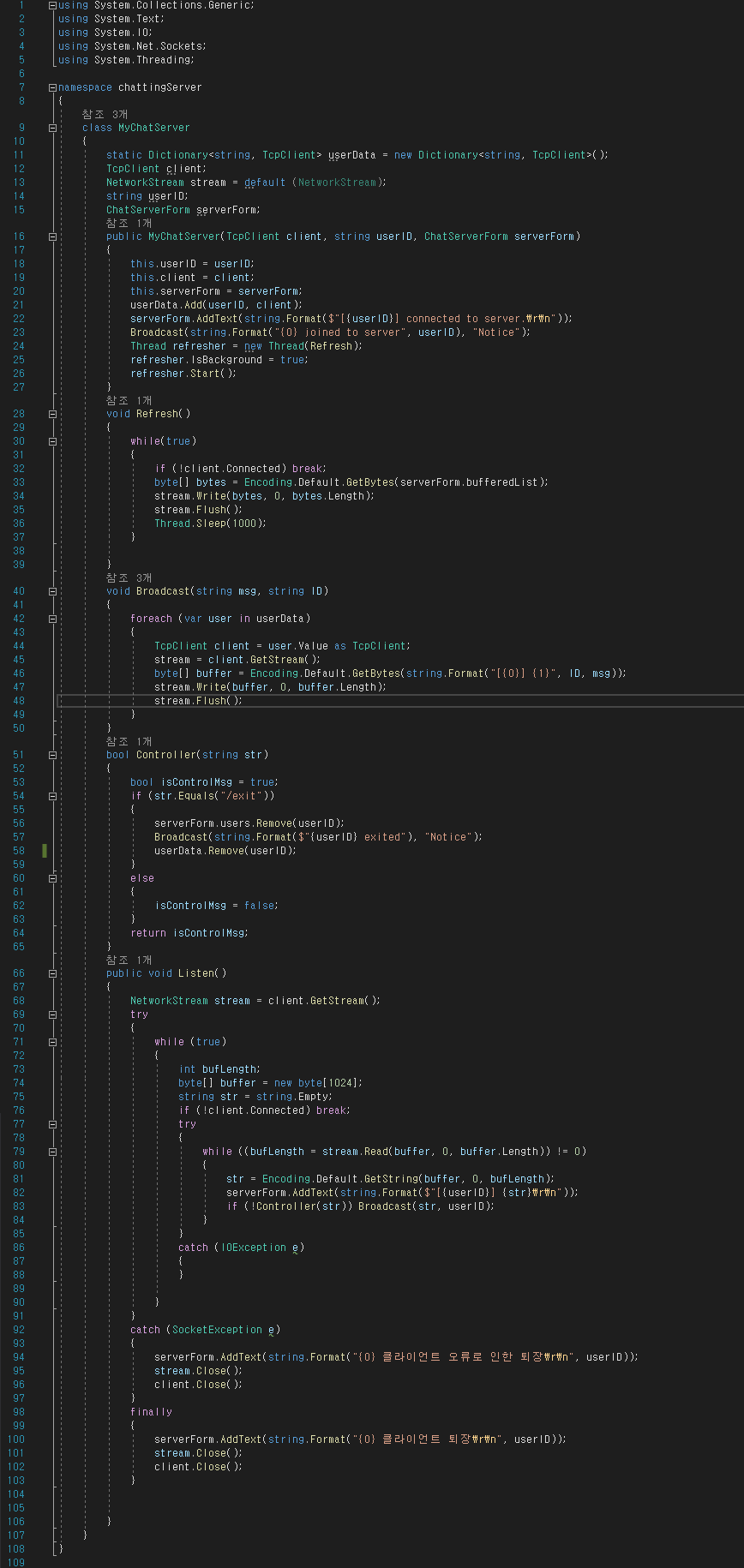 각 클라이언트와 통신을 담당할 MyChatServer.cs 코드입니다.