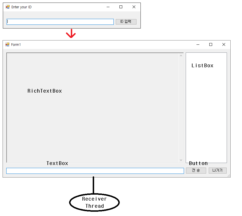취향에 맞게 꾸미셔도 됩니다. Load시 ChatServerForm_Load() 메소드를 실행하게끔 합니다.